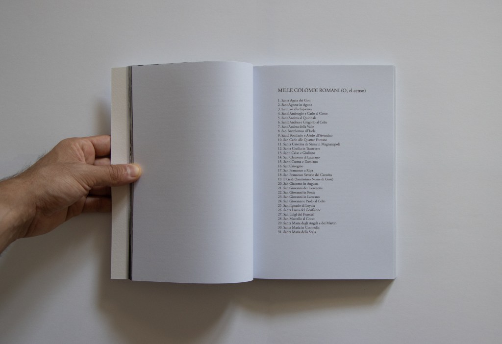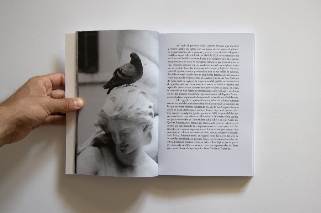 Durante dos meses, se llevó a cabo un censo de palomas representadas en el interior de 62 iglesias romanas, identificando en este ejercicio la ubicación de dichas representaciones, sus características formales, autoría y fecha de creación, siempre y cuando fue posible. Este archivo personal se materializó como libro de artista que recoge la experiencia como una especie de atlas donde la ciudad es reinterpretada desde una mirada de atención hacia este animal no humano y su pervivencia como imagen en el marco del poder eclesiástico y la propia Historia del Arte.